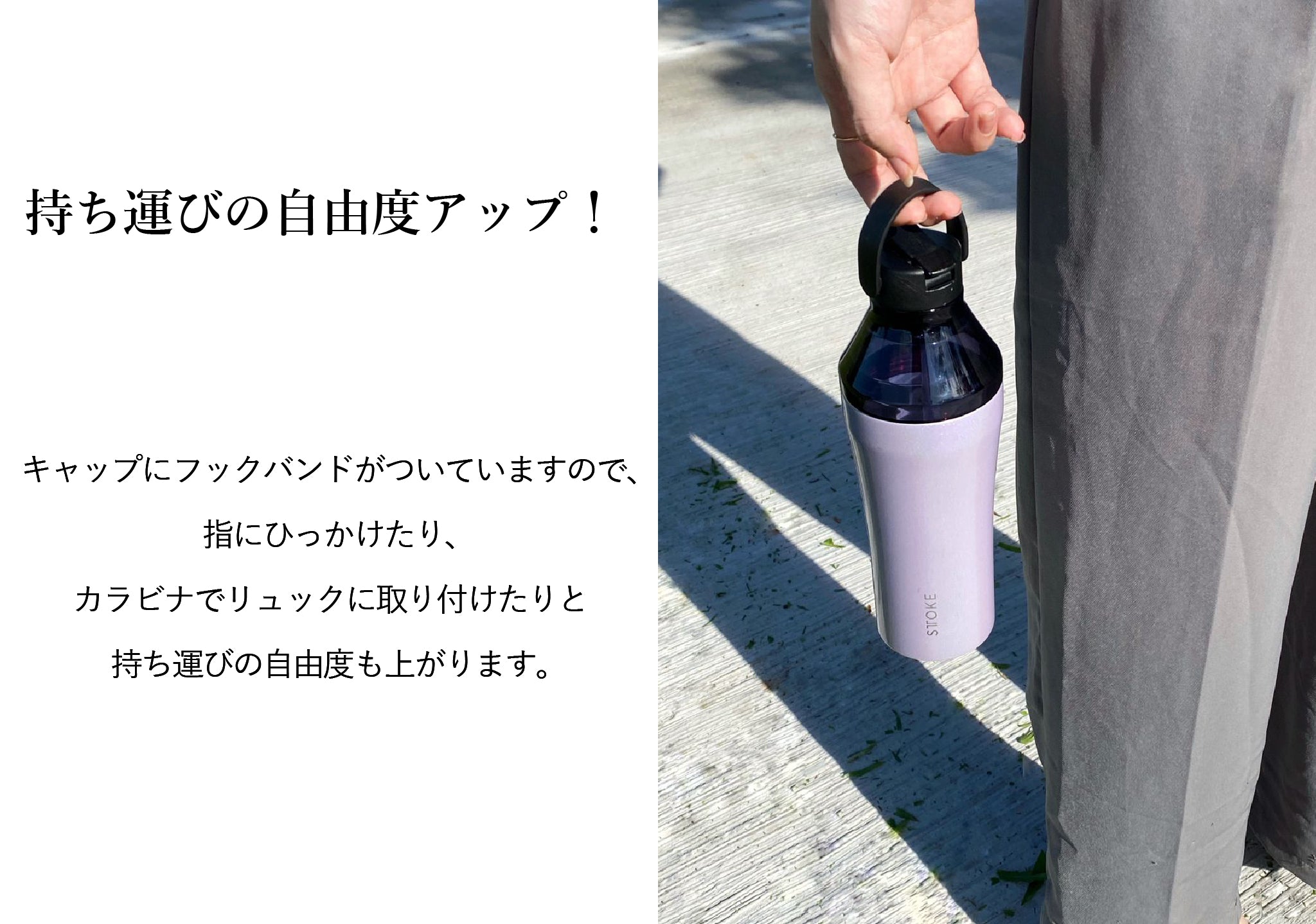 キャップにフックバンドがついていますので、指にひっかけたり、カラビナでリュックに取り付けたりと持ち運びの自由度も上がります。